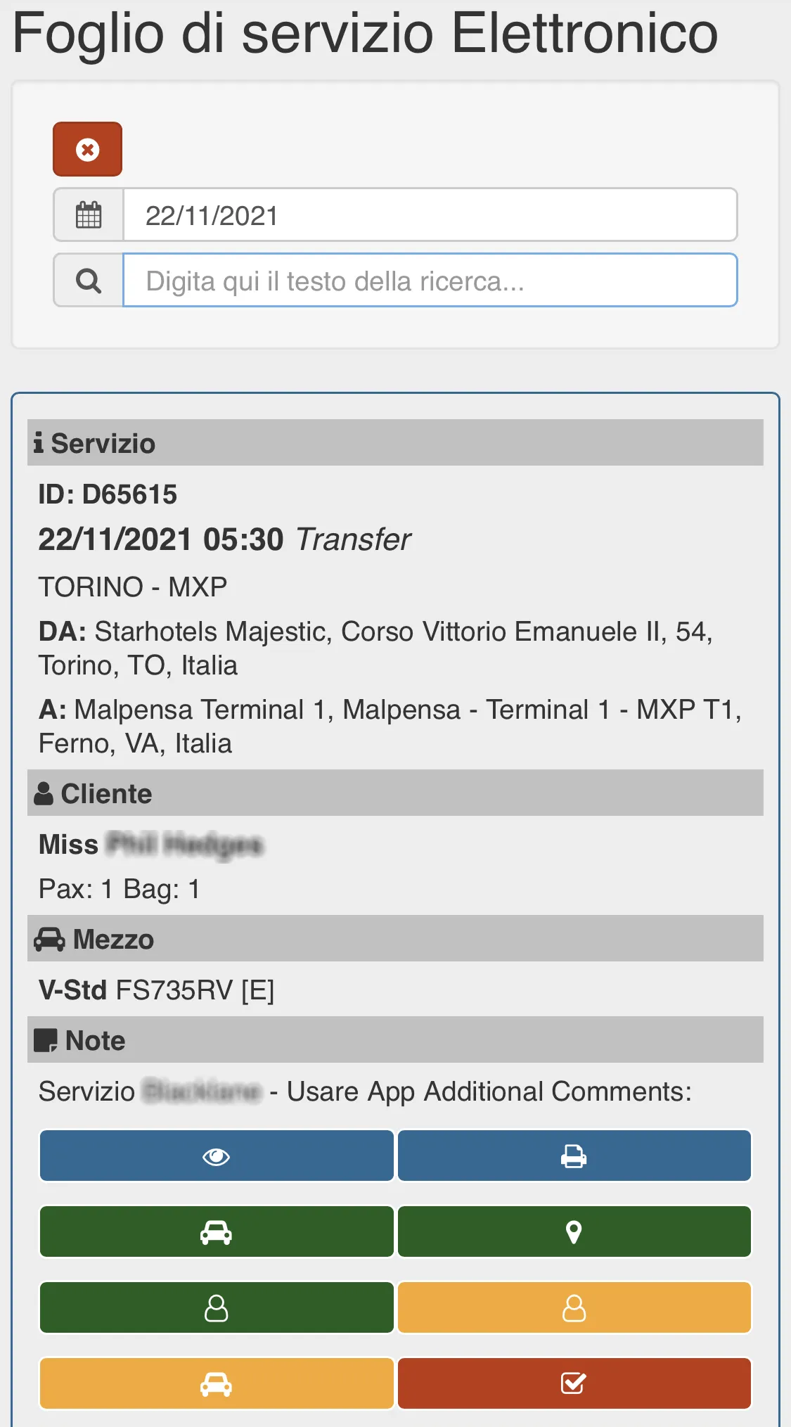 NCC è dotato di una dashboard specifica per gli autisti che rappresenta il foglio di servizio elettronico. La dashboard, consultabile per giorno, contiene la lista di tutti i servizi da fare nella giornata, rappresentati attraverso tutte le informazioni che servono all’autista: Giorno, ora, tipo di servizio, Da, A, Cliente, Mezzo da utilizzare e le note inserite dalla sede. Attraverso la propria dashboard l’autista potrà comunicare alla sede, di aver visionato l’assegnazione, di aver prelevato il mezzo, di essere in posizione per il pickup, di aver effettuato il pickup, di aver effettuato il drop off del passeggero, di aver effettuato il drop off del mezzo, la chiusura del servizio. La dashboard è disponibile anche in versione mobile.