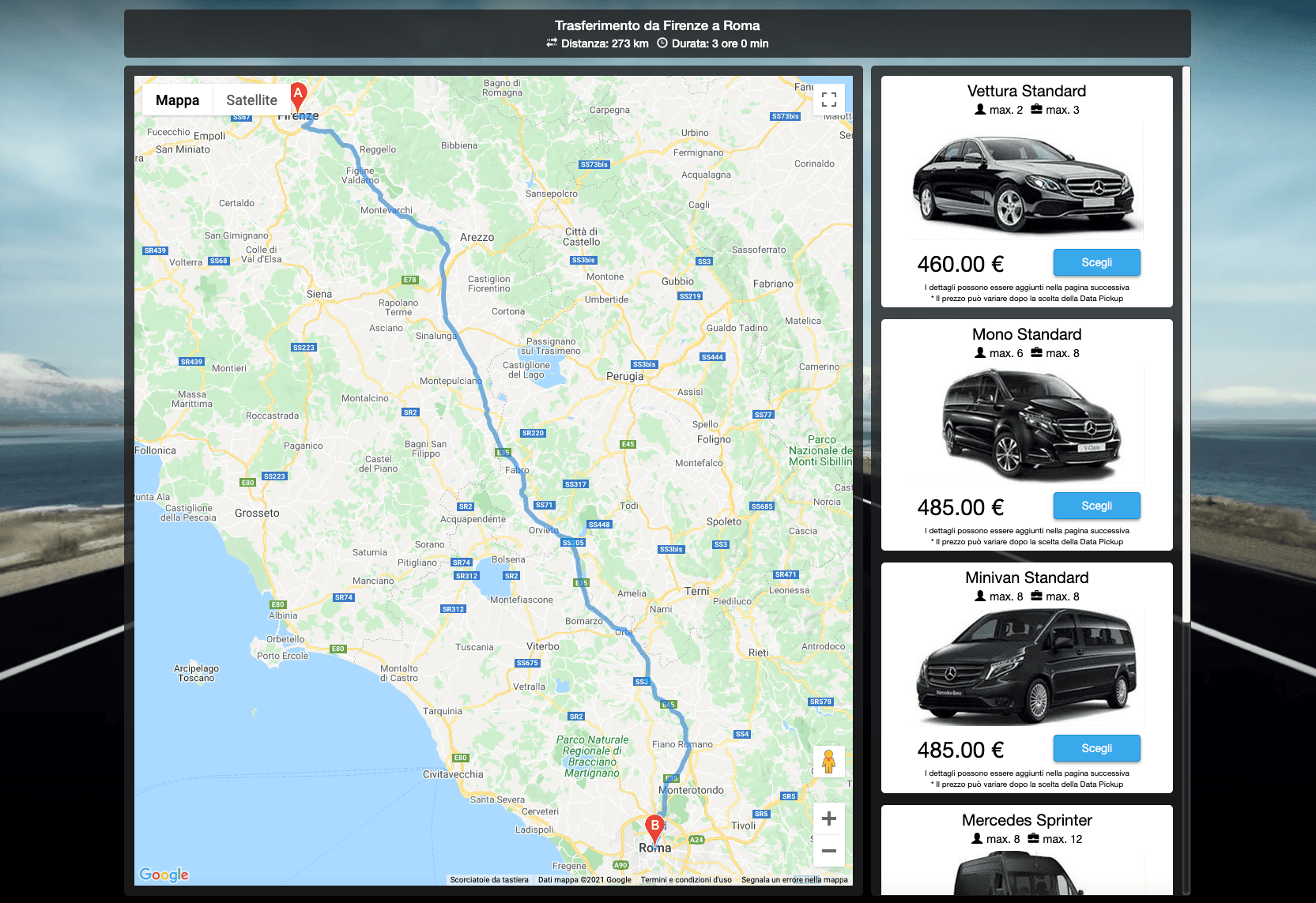 Visualizzazione su mappa, tariffe personalizzate e opzioni aggiuntive per i transfer.